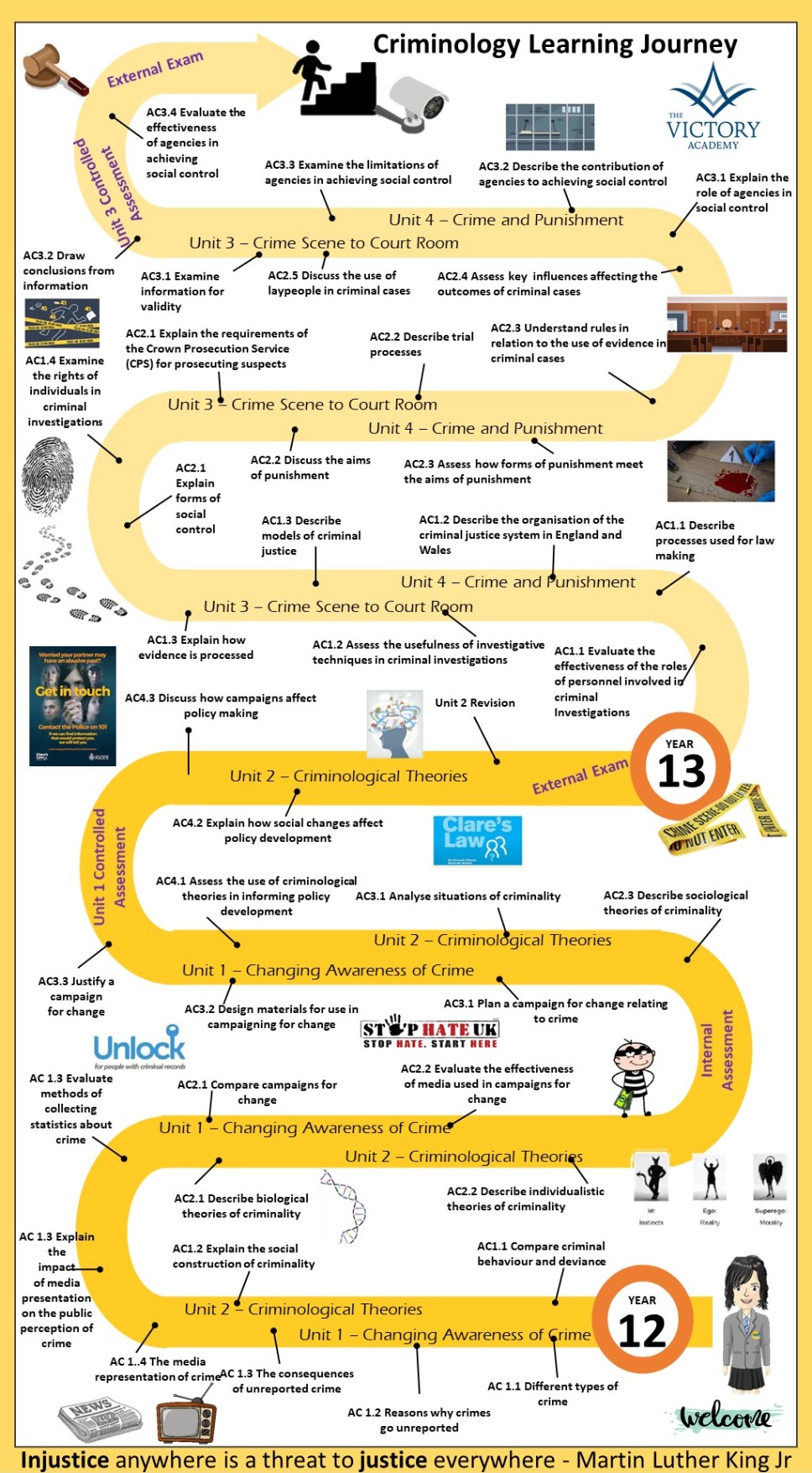 Our intent is to explore and engage with different areas within criminology, that takes the students beyond their existing knowledge of what is a crime and the different types of crime in the UK. The intent of the criminology curriculum is to equip students with an array of critical skills and an analytical frame of mind. This course gives our students a good basis of knowledge and understanding of Criminology for progression opportunities to further academic study. Whatever the next steps for our students, they can take the ‘transferable skills’ and use them flexibly to their best effect.