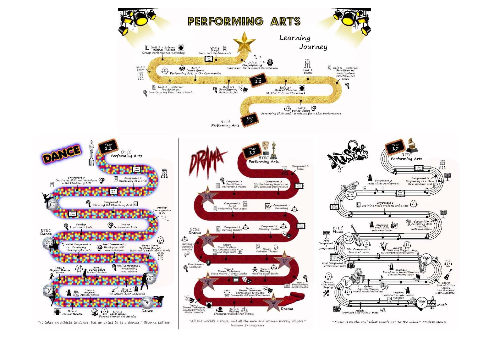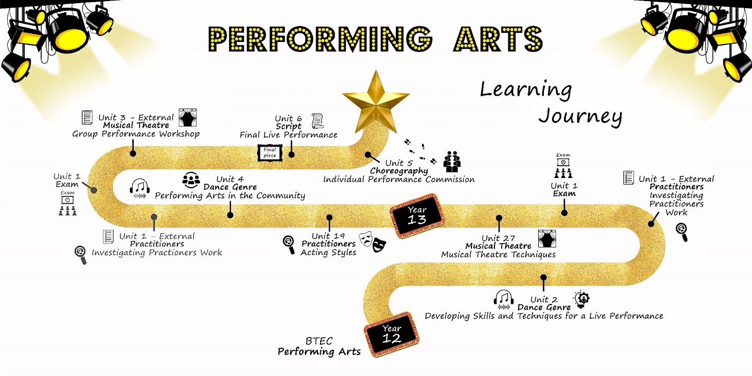 Within the Performing Arts pathways, students will be studying a wide range of practitioners. They will look at the history of how that practitioner became who they were and what they are known for, the style and genre of that practitioner and look at performance works. Students will study musical theatre as a whole and will have insight on Dance, Drama and Music both separately and as one. Students will also be assessed on both practical and theory work within this area.
