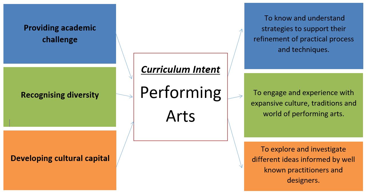 We support students to pursue their ambitions and goals across all avenues within Performing Arts, nurturing resilience, creativity, empathetic and personal management skills alongside exploring a wide range of historical periods, genres, cultures and traditions to hone their own practical and analytical skills. Students create their own work, inspired by world-renowned composers, choreographers and directors; developing an appreciation for how early pieces are relatable to the lives we know today. Our aim is for students to develop into self-aware, vocal and socially responsible individuals; able to critically assess and establish their role in society as emotionally intelligent individuals.