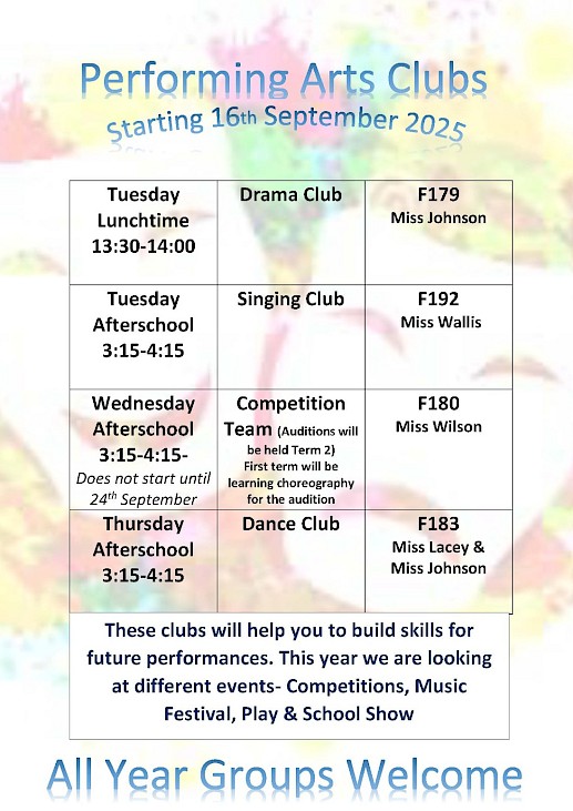 Studying cultural education subjects, such as dance, drama and music, sparks creativity across the curriculum. We encourage students to be inquisitive, disciplined and determined. Within year 7 students work on a carousel in Dance and Drama in which they will study each discipline three times a year. and Music is studied once every two weeks. This will give students insight on all pathways and topics within the Performing Arts. Students will build on their confidence, creativity and organisation.