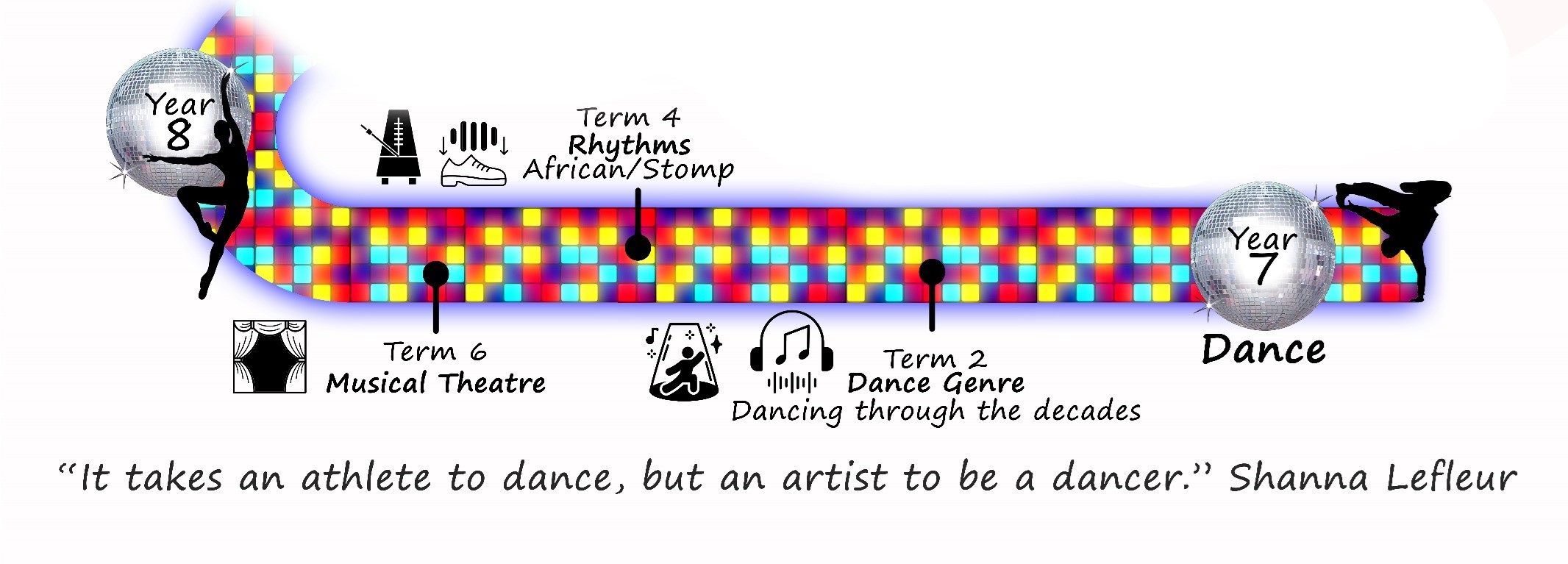 Dance- Within Dance students, study a wide range of different genres. This encourages students to step outside the box, learn about different cultures and practitioners and challenges them within their learning. Students will work within groups and will perform their work created. They will be assessed each term in the following areas; Knowledge, Creativity, Performance and Evaluation. Topics students will be studying within dance are; Dancing through the decades, African Dance and Musical Theatre. These topics are focused on practitioners within each genre and allow students to build on their subject knowledge as well as their choreographic skills.