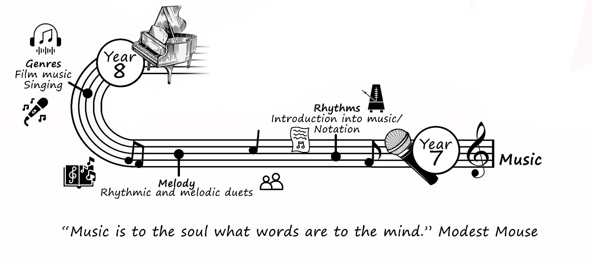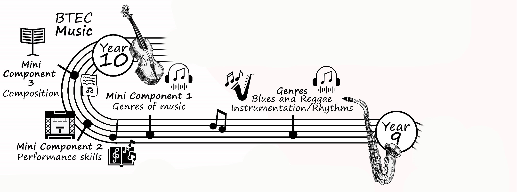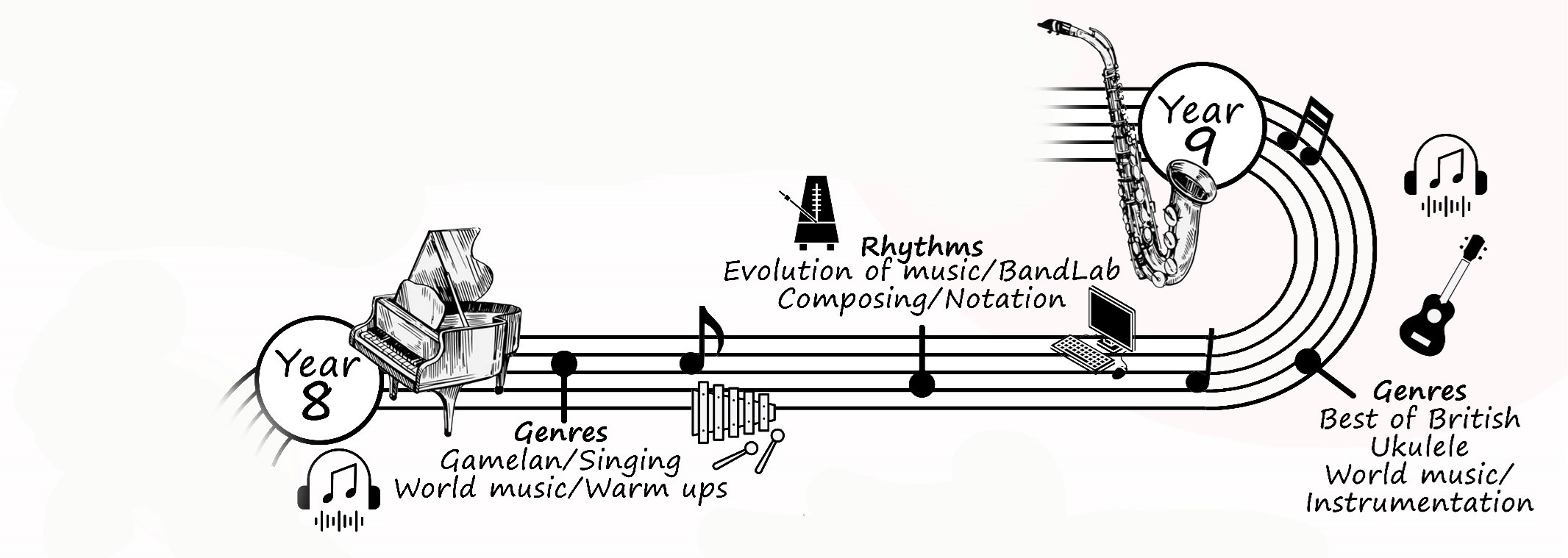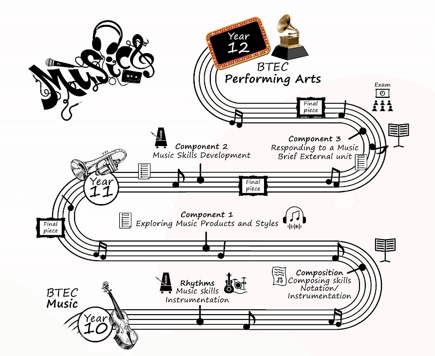 Within the Music pathway, students will be studying the theory behind music. They will be deepening their knowledge, looking at the history of practitioners, music styles, the wide range of instruments and the commonalities in music then with music we hear today. Students will be looking at Blues, Reggae, Performance and compositional skills alongside the music technology route such as; sampling, looping and producing. This will allow students to establish where their strengths are within music and will encourage them to take the next time within key stage 4.