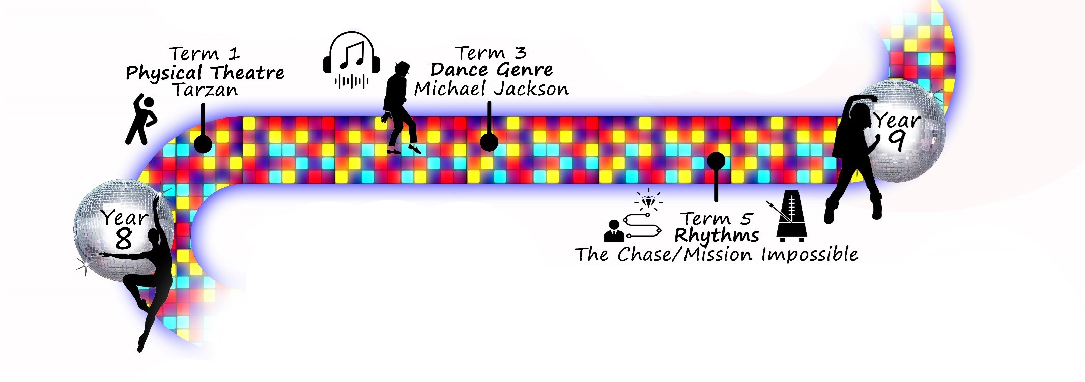 Dance- Students explore a range of styles and techniques to improve both performance and choreography skills. They will develop expressive movement and storytelling through Physical Theatre, study the unique performance style of Michael Jackson, and perform high-energy routines inspired by soundtracks such as The Chase and Mission Impossible.