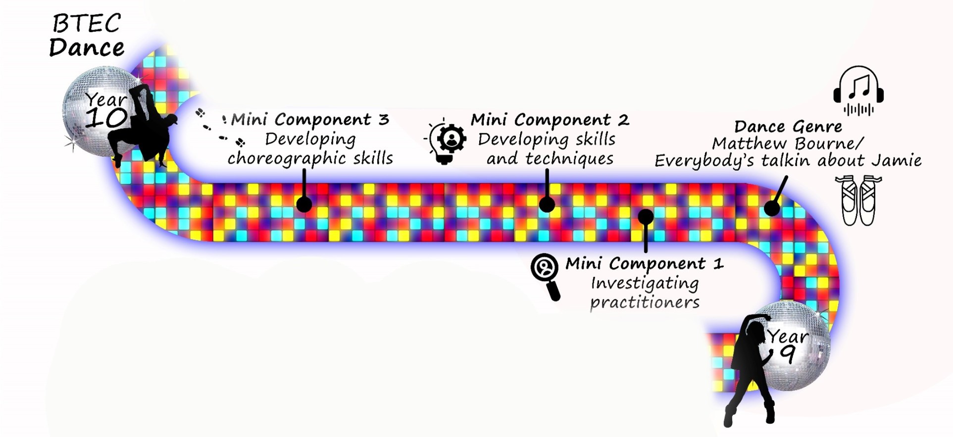 In Year 9, students undertaking the Dance pathway will follow a structured curriculum designed to introduce the knowledge and skills required for the BTEC Tech Award in Dance. They will study professional works such as The Nutcracker and Everybody’s Talking About Jamie, developing analytical skills by examining how choreographers and performers communicate themes and intentions through movement. Students will focus on the skills and techniques of a performer, with particular attention to physical, technical, and expressive qualities, as well as the application of safe practice. Choreographic skills will be embedded through practical tasks that require students to respond creatively to a variety of stimuli, while also exploring the work of key practitioners and significant dance performances, some of which will be recreated to build understanding of professional repertoire. Learning will be organised into mini-components modelled on the BTEC Tech Award assessment framework, ensuring students are well prepared for the demands of the qualification at Key Stage 4.