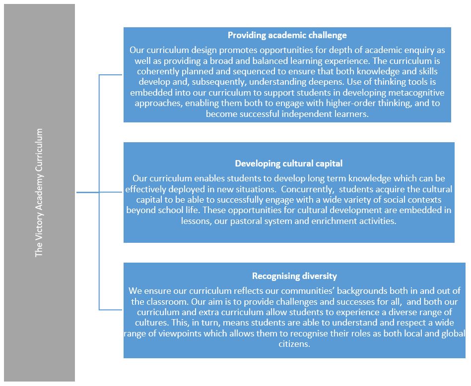 At The Victory Academy we strive to provide a challenging, rewarding, and diverse curriculum that enhances cultural capital and leads to strong outcomes for all students, regardless of their starting points.